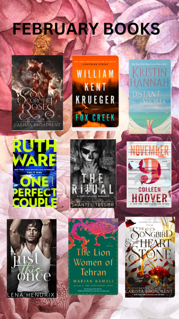 My favorite book for February was Just This Once by Lena Hendrix followed by The Ritual by Shantel Tessier. I personally did not like One Perfect Couple by Ruth Ware.